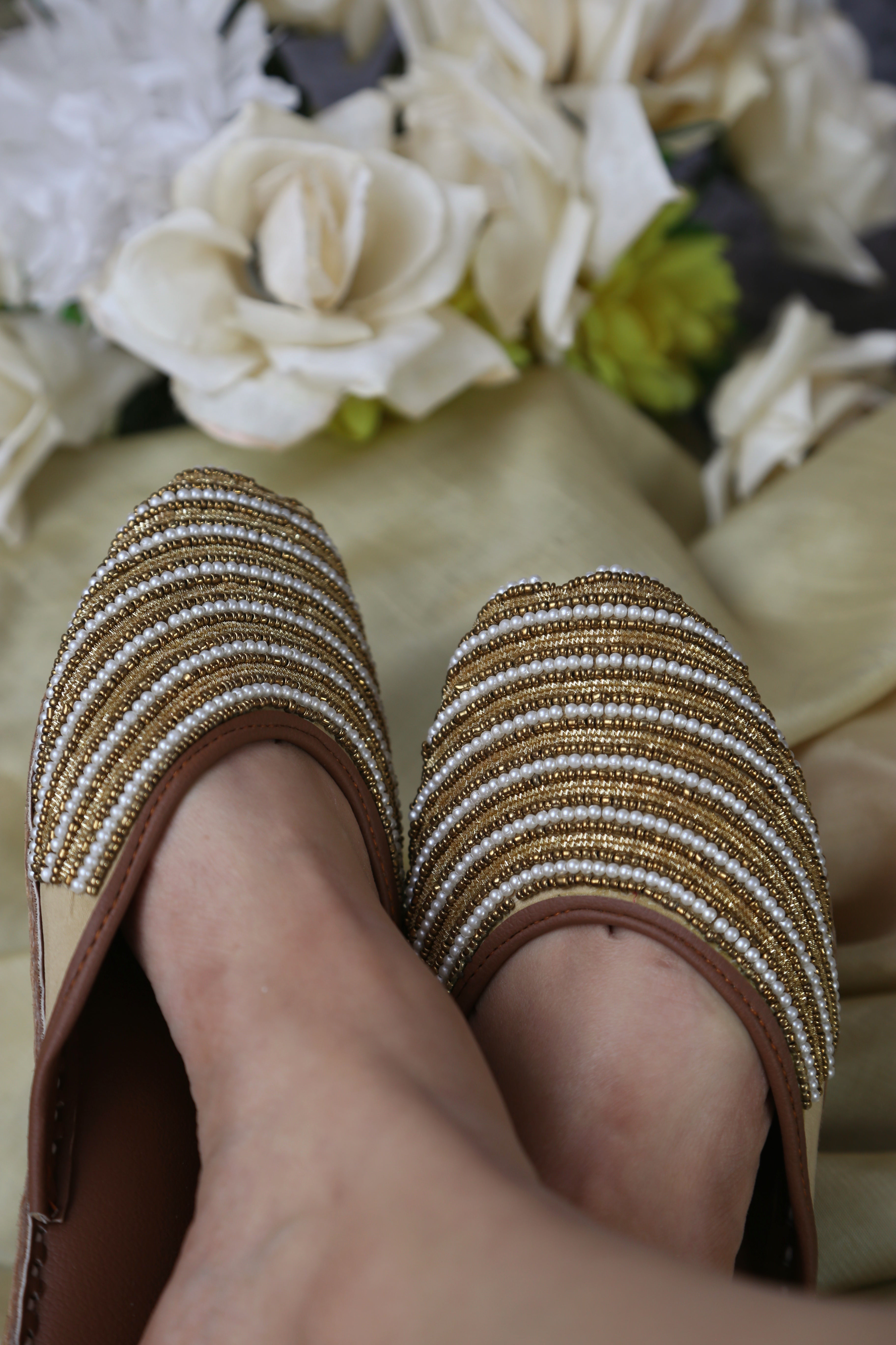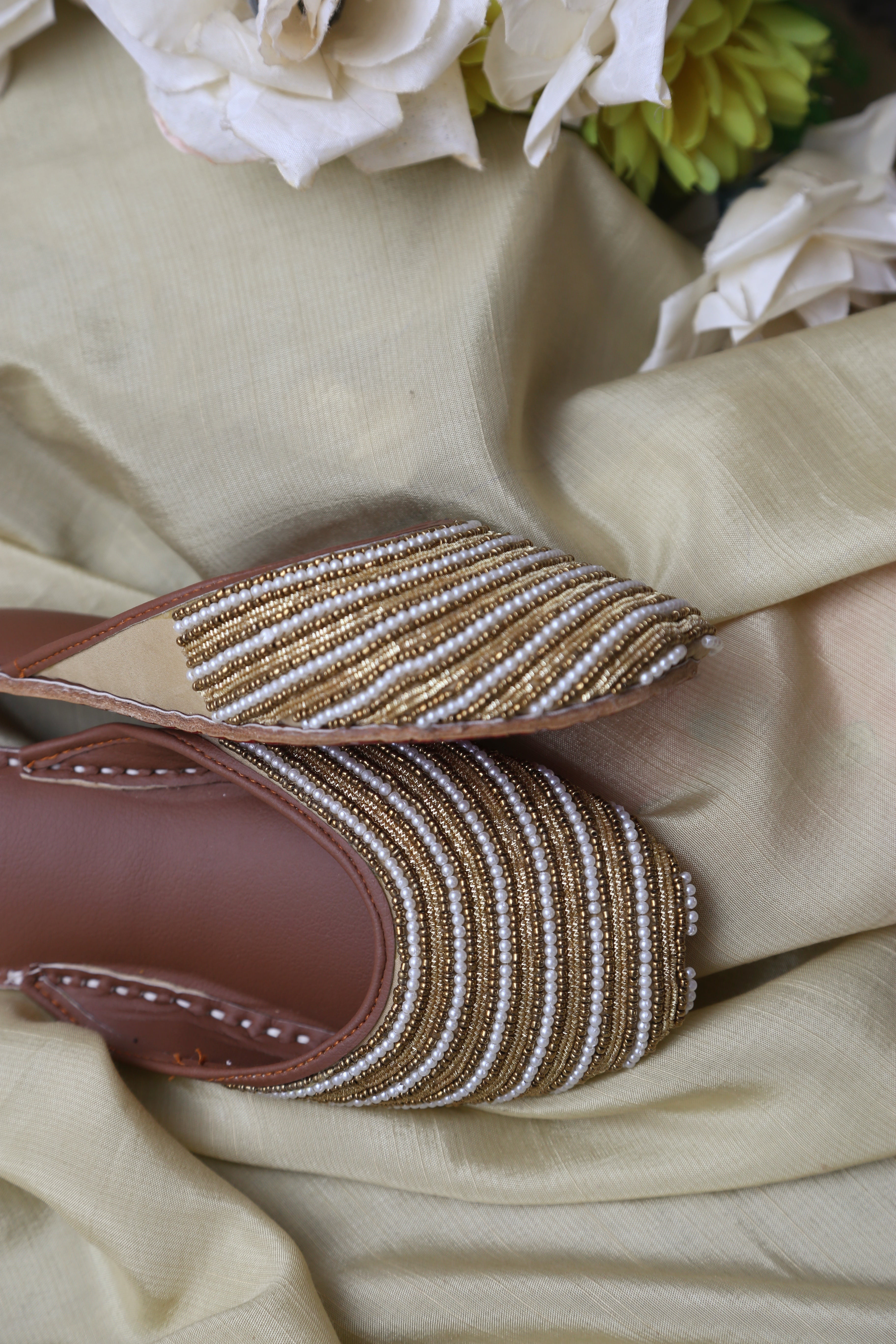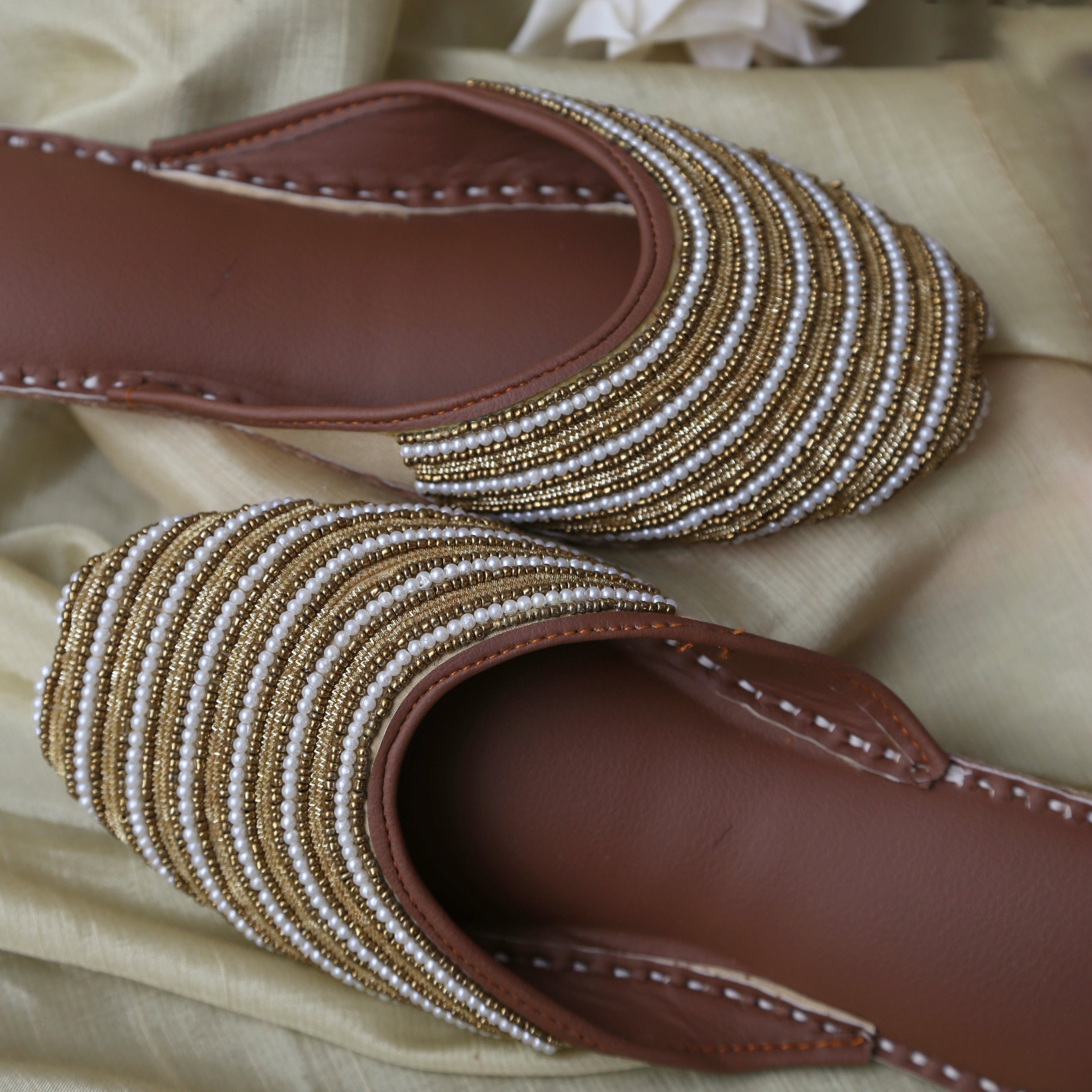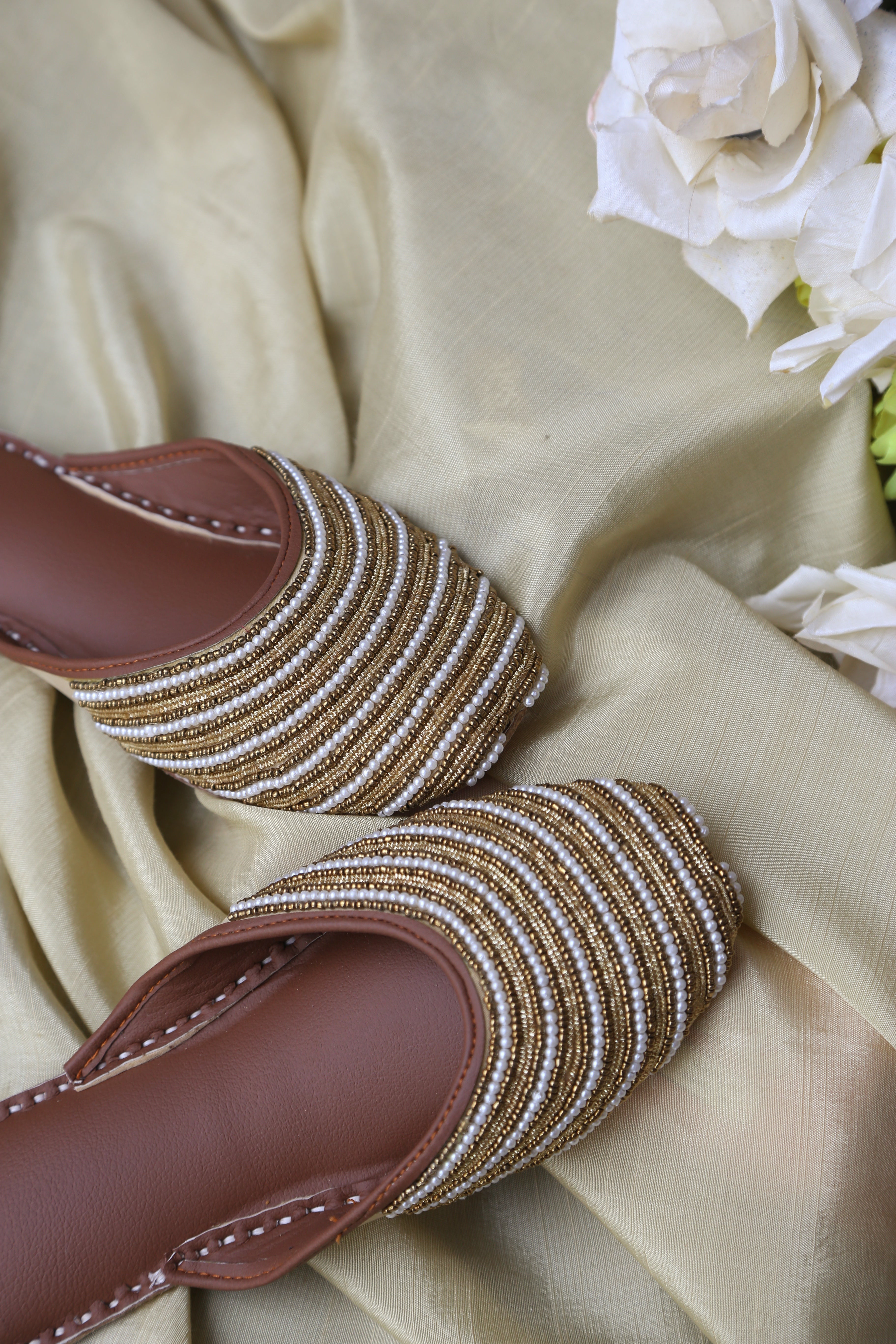A design that carries meaning in every detail. Crafted for women who appreciate subtle luxury, this backless khussa features meticulously hand-stitched pearl and bead detailing arranged in elegant layered rows, creating a refined yet timeless look.