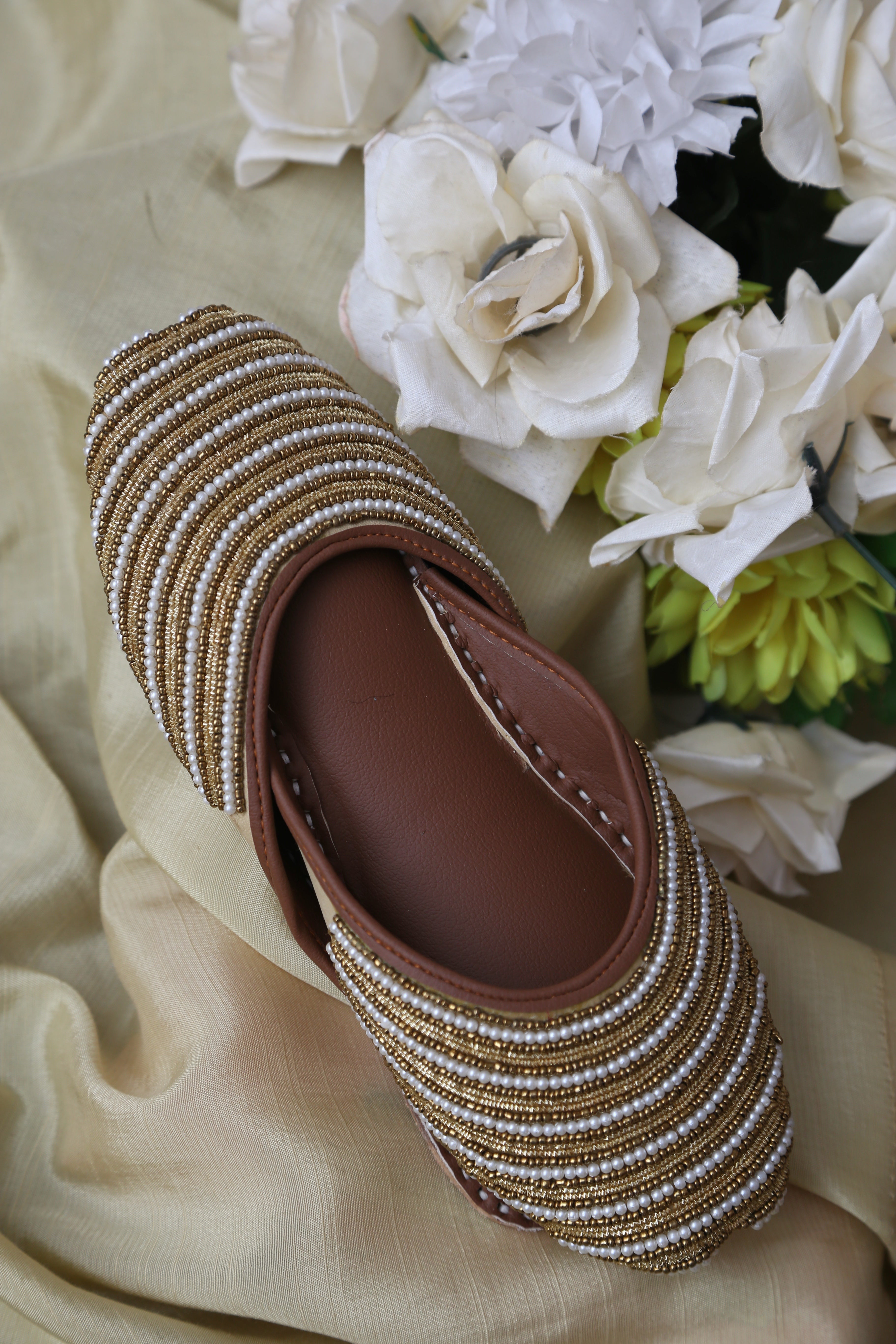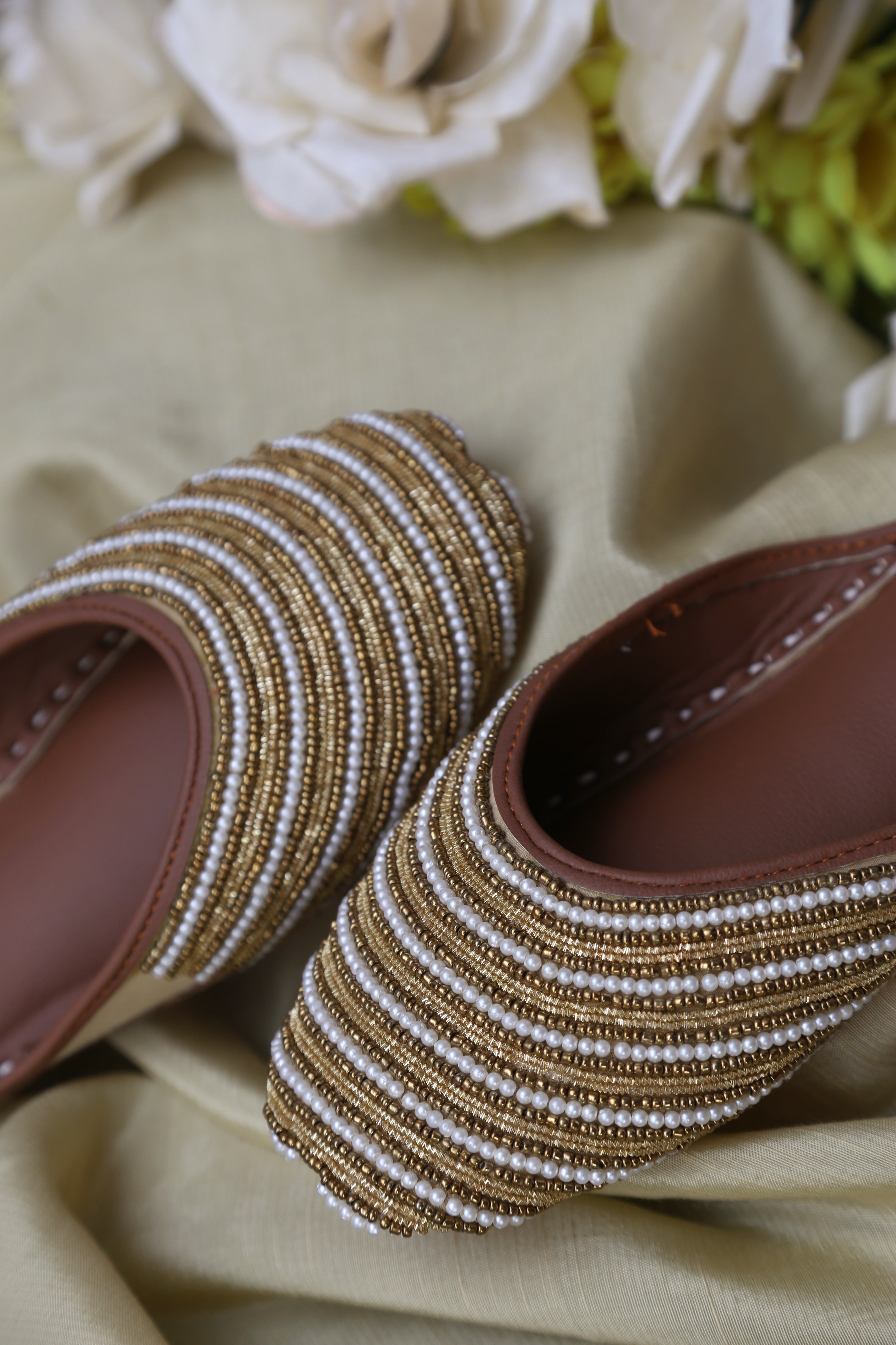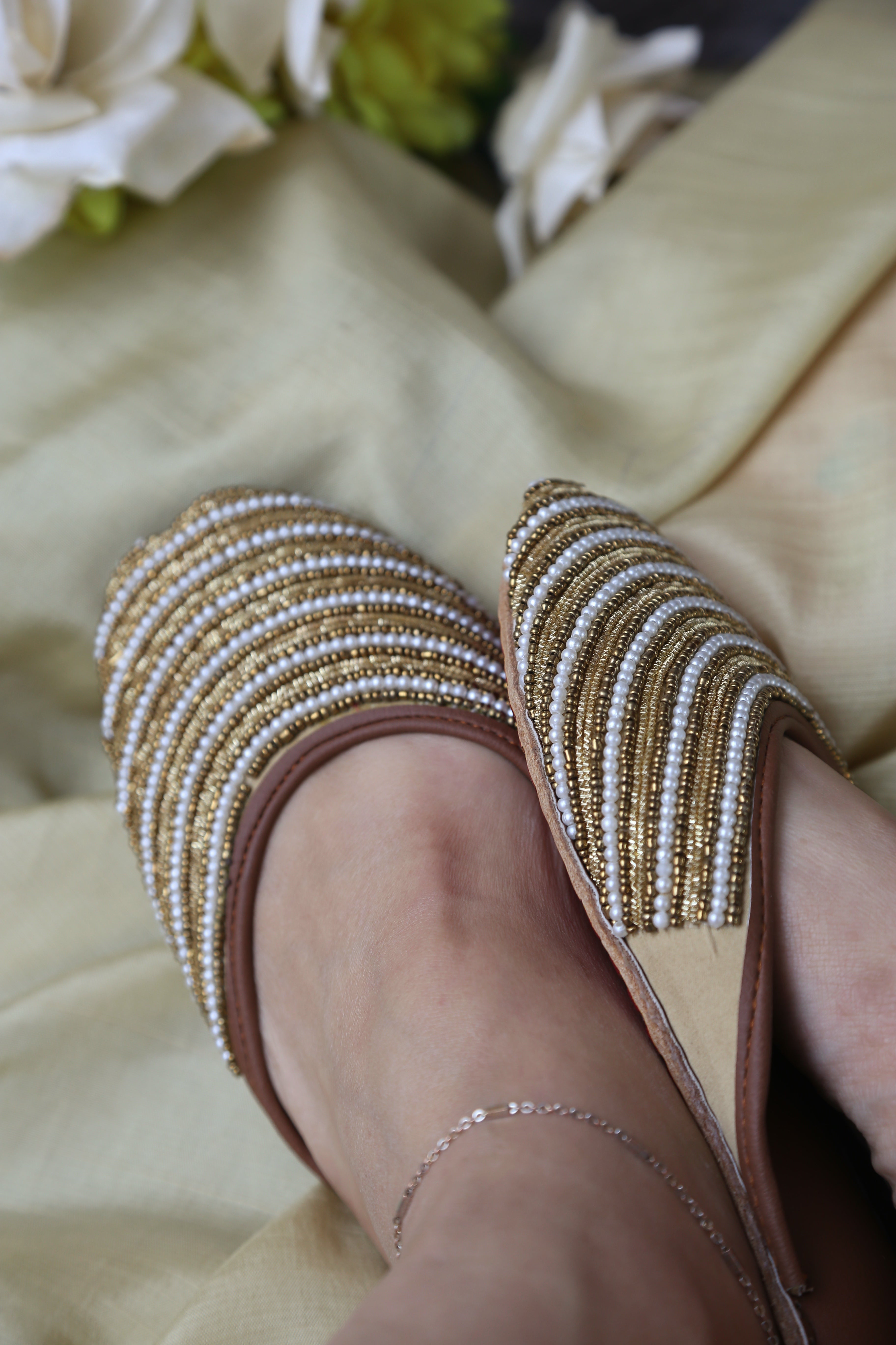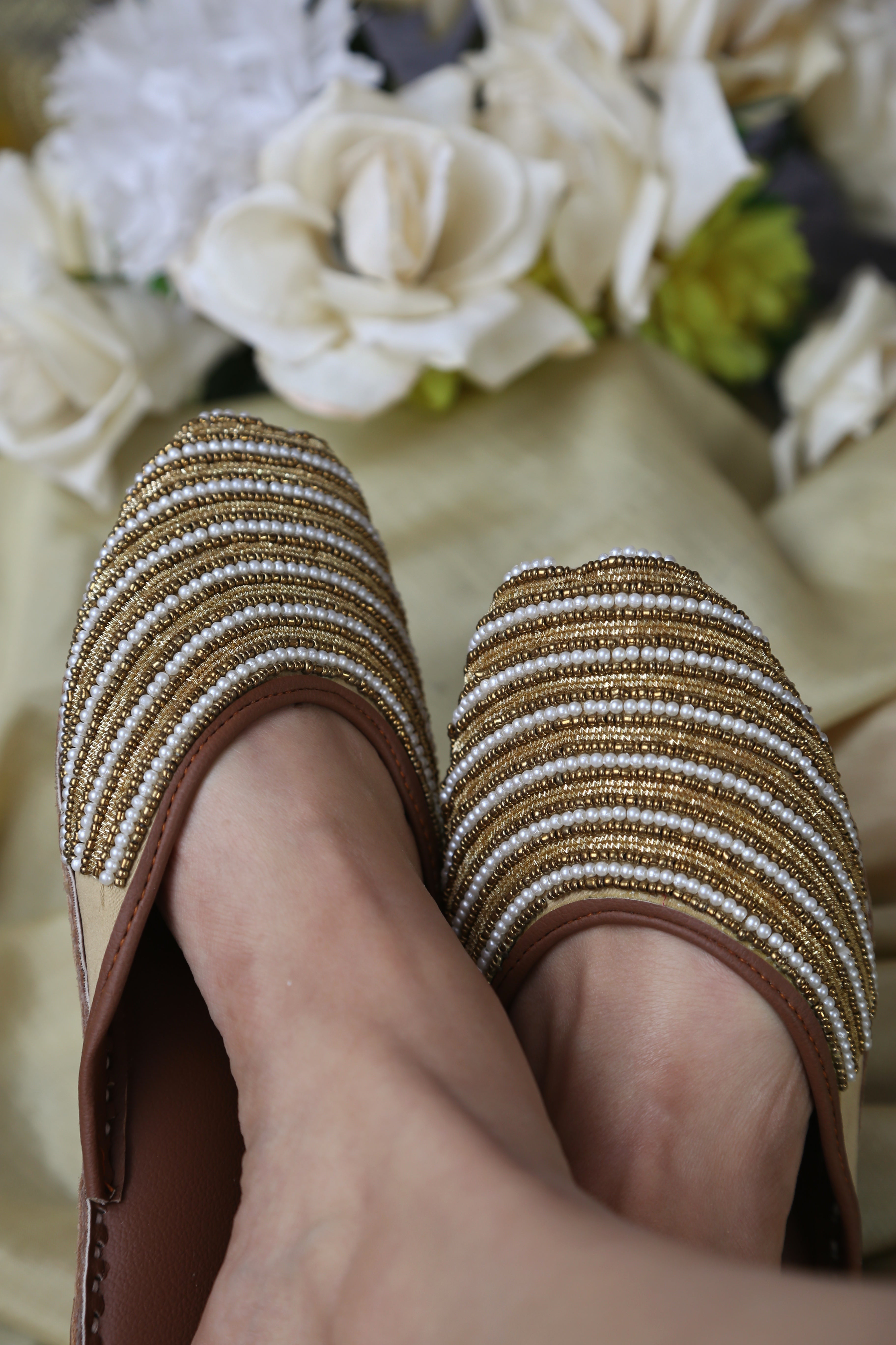 A design that carries meaning in every detail. Crafted for women who appreciate subtle luxury, this backless khussa features meticulously hand-stitched pearl and bead detailing arranged in elegant layered rows, creating a refined yet timeless look.
