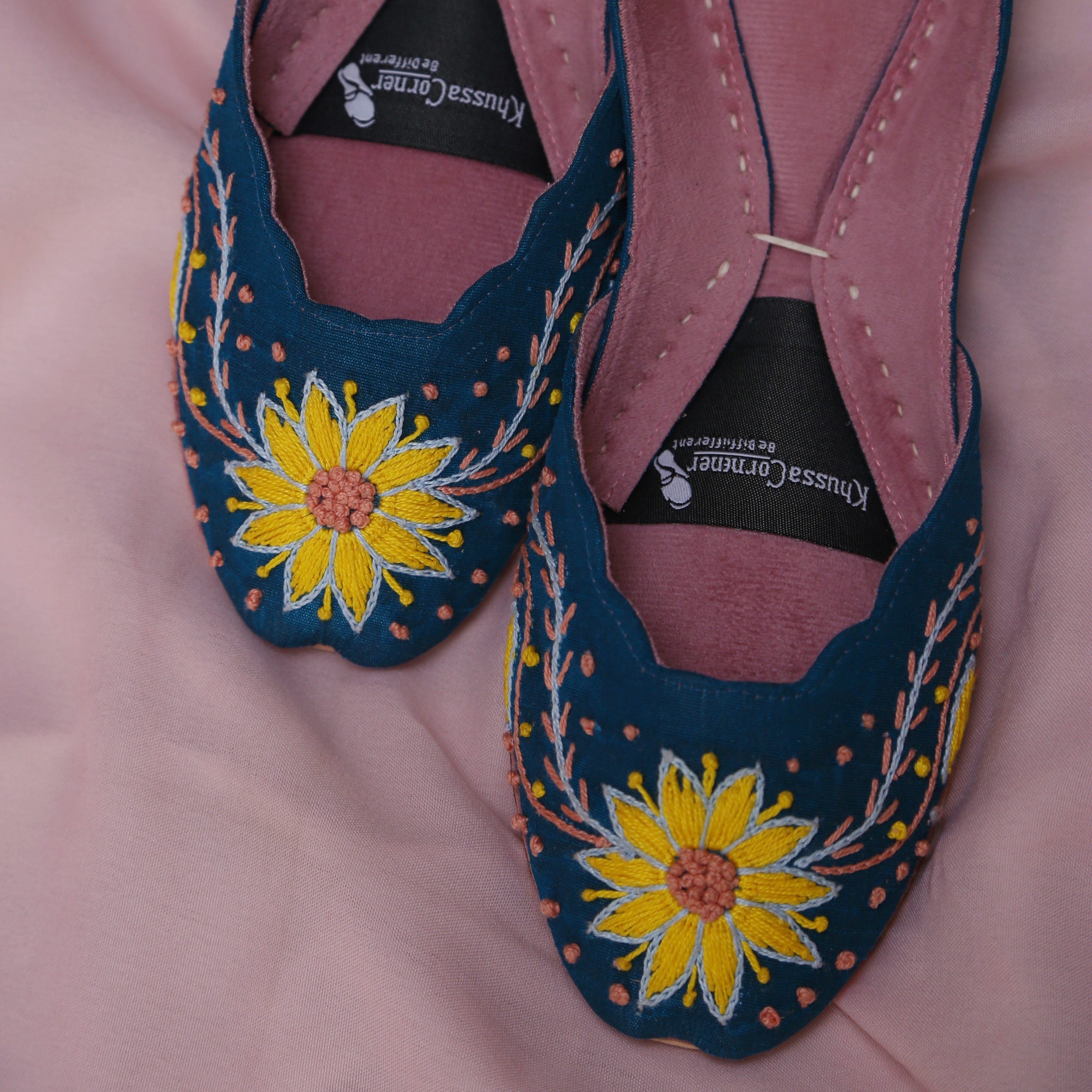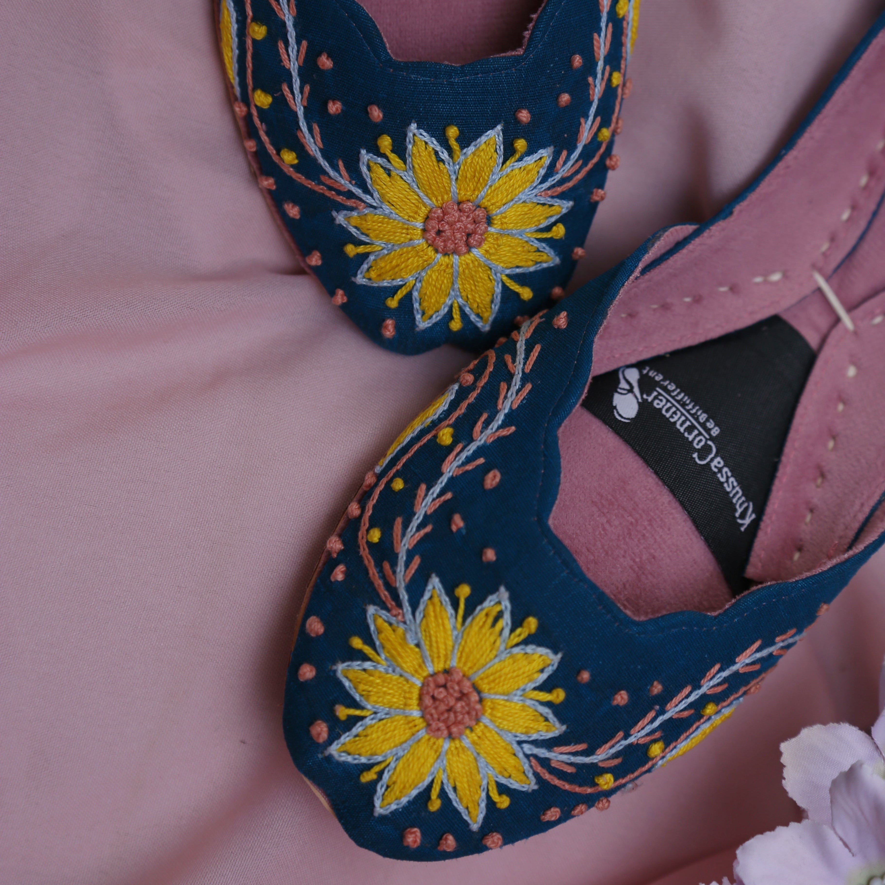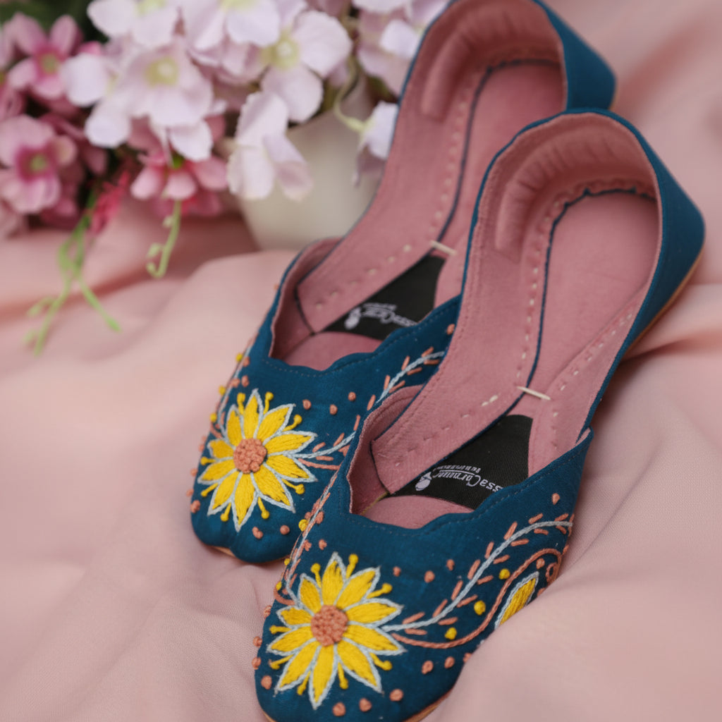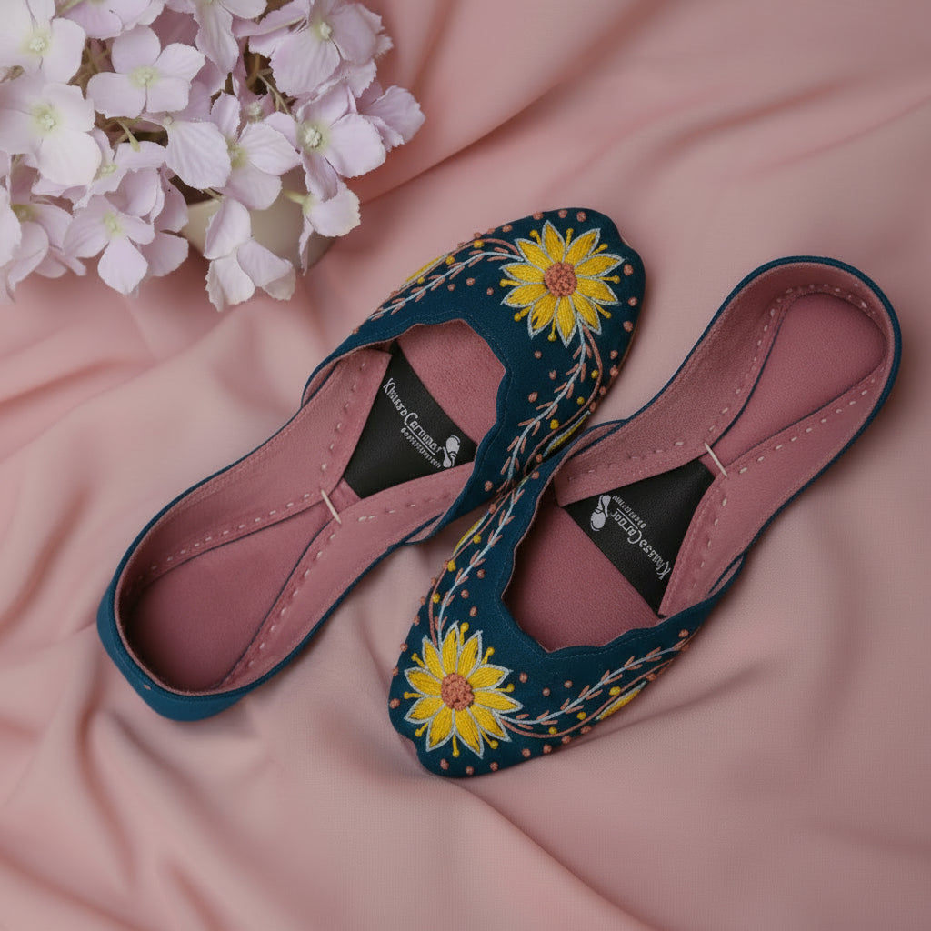 Inspired by the warmth of sunflowers and crafted with artisanal precision, Mukhi Khussa is a celebration of color, comfort, and craftsmanship. Set on a rich blue base, this khussa features delicate hand embroidery inspired by blooming sunflowers—symbolizing joy, strength, and elegance.