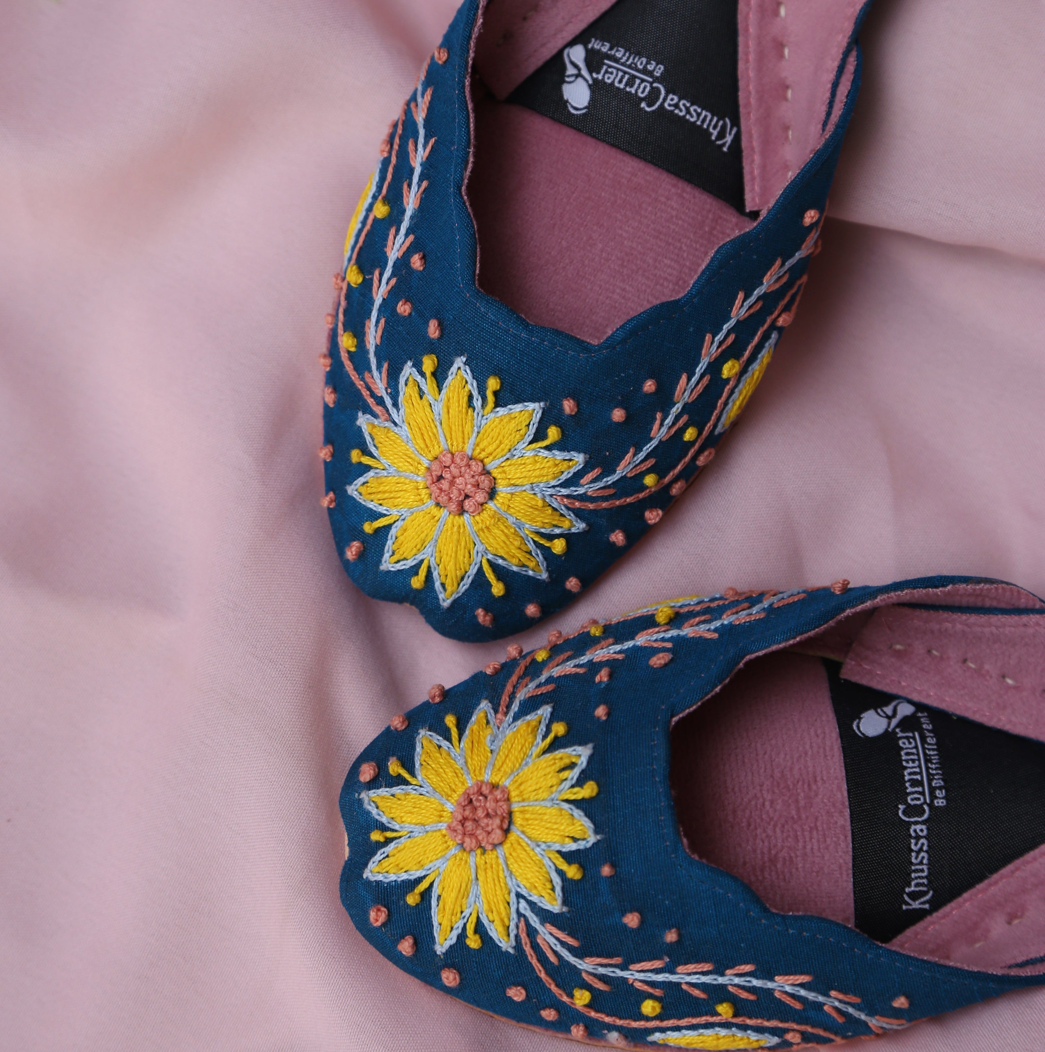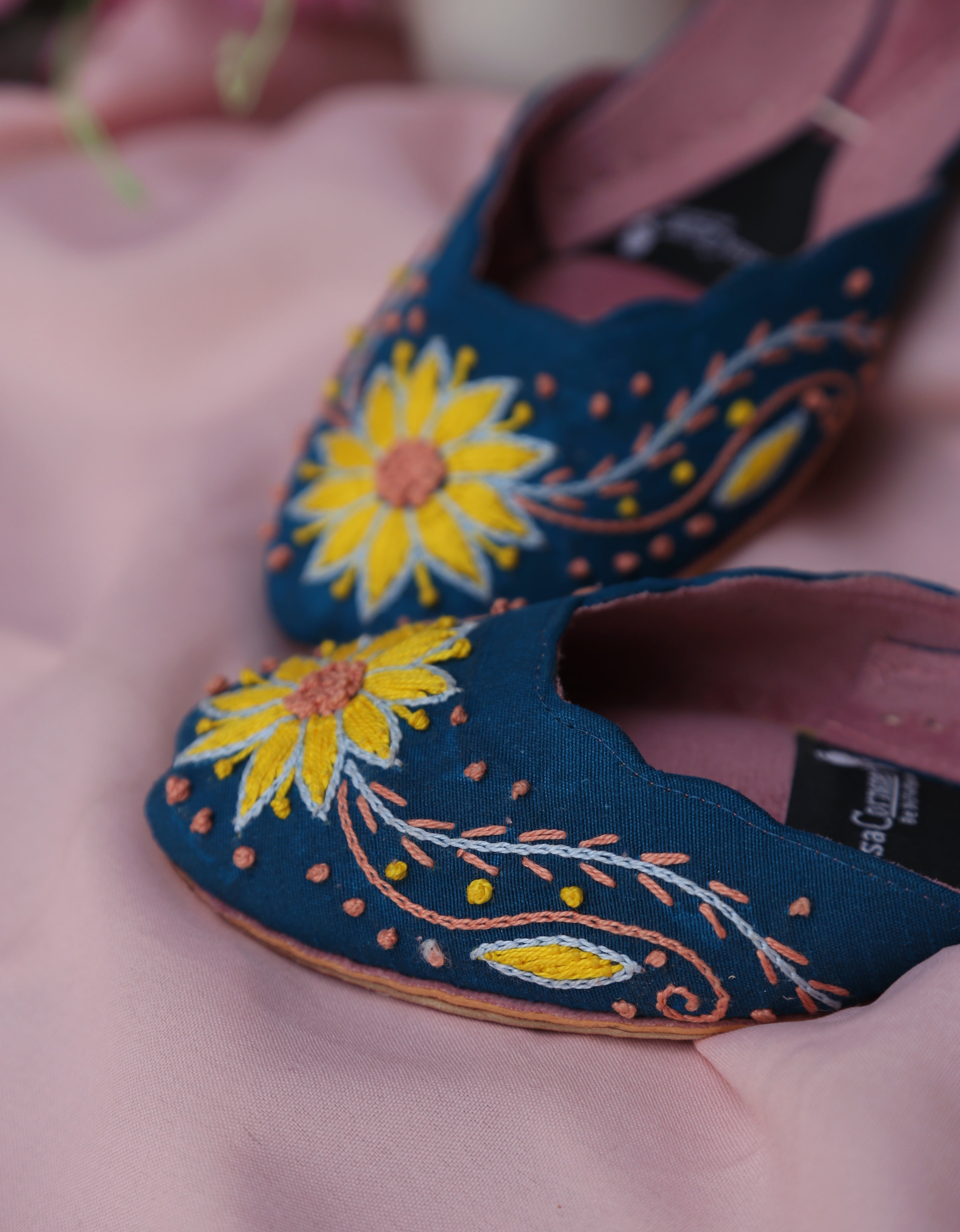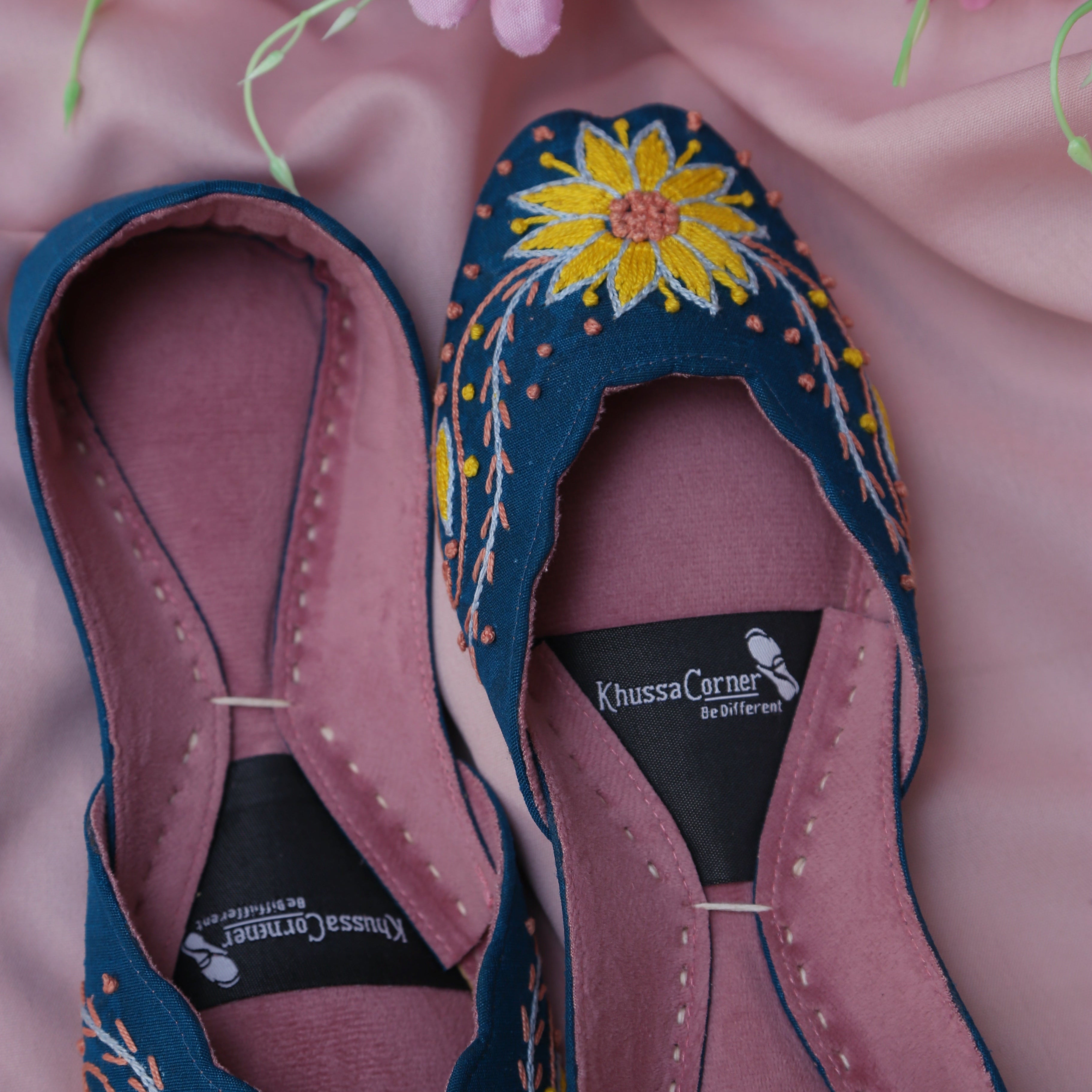 Inspired by the warmth of sunflowers and crafted with artisanal precision, Mukhi Khussa is a celebration of color, comfort, and craftsmanship. Set on a rich blue base, this khussa features delicate hand embroidery inspired by blooming sunflowers—symbolizing joy, strength, and elegance.