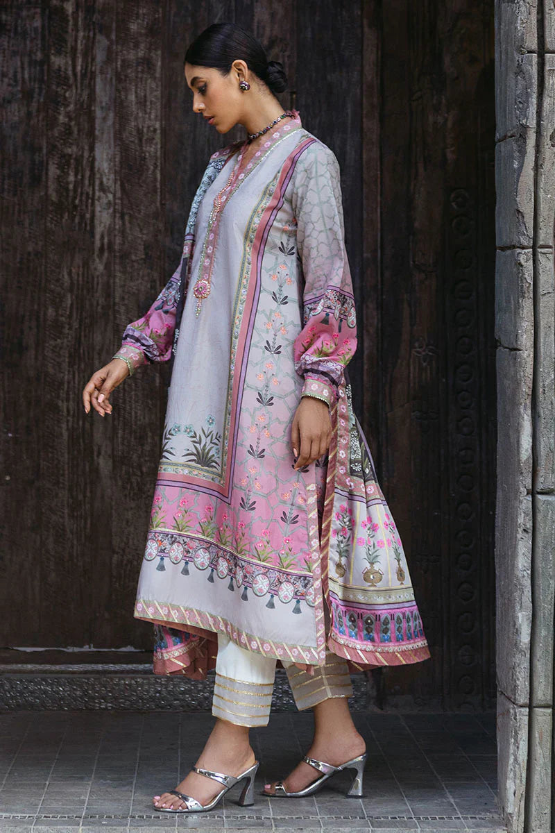 Pewter is an elegant fusion of grey and pink, crafted from sumptuous printed raw silk. This outfit features intricate embellishments that add a touch of glamour, complemented by a graceful silk dupatta.
