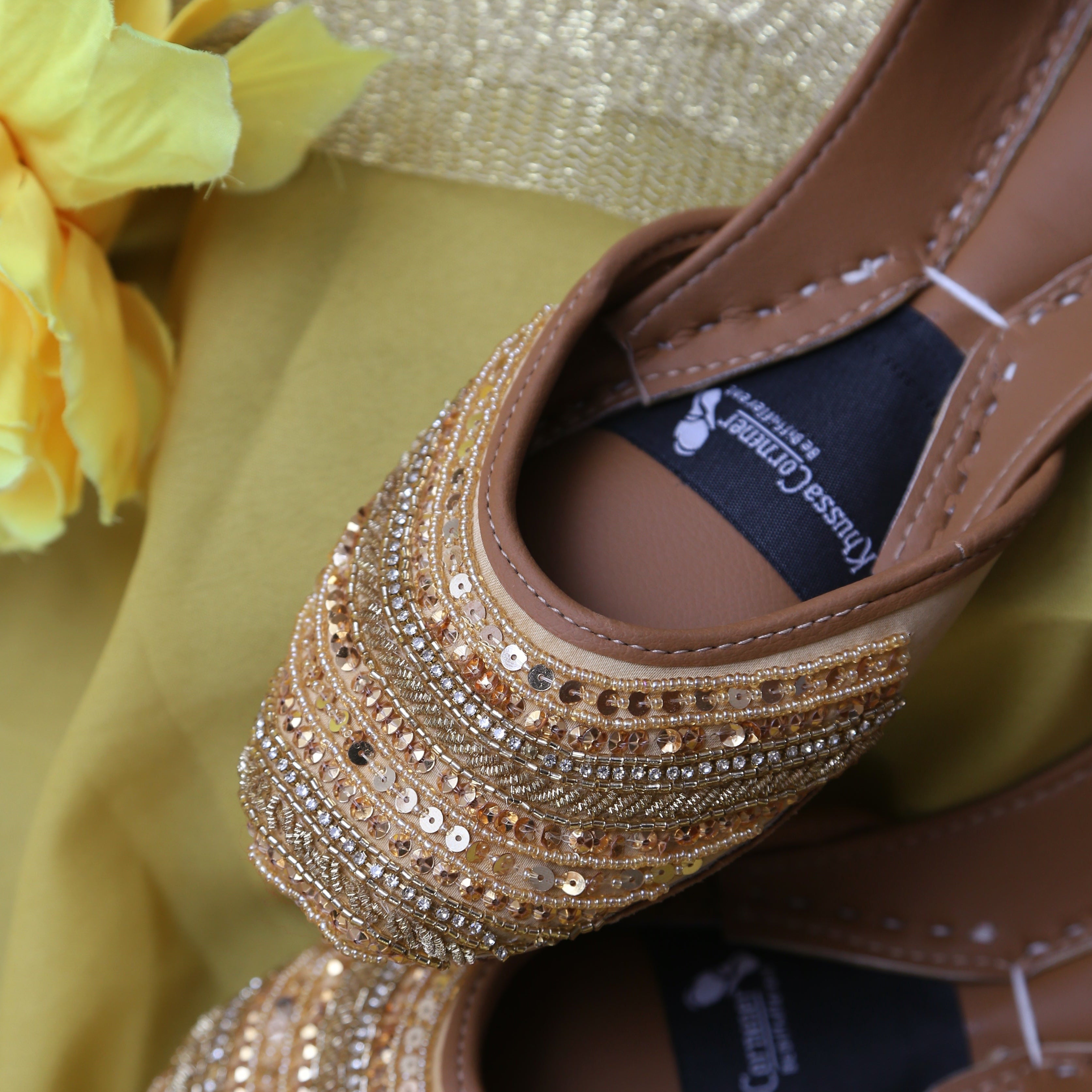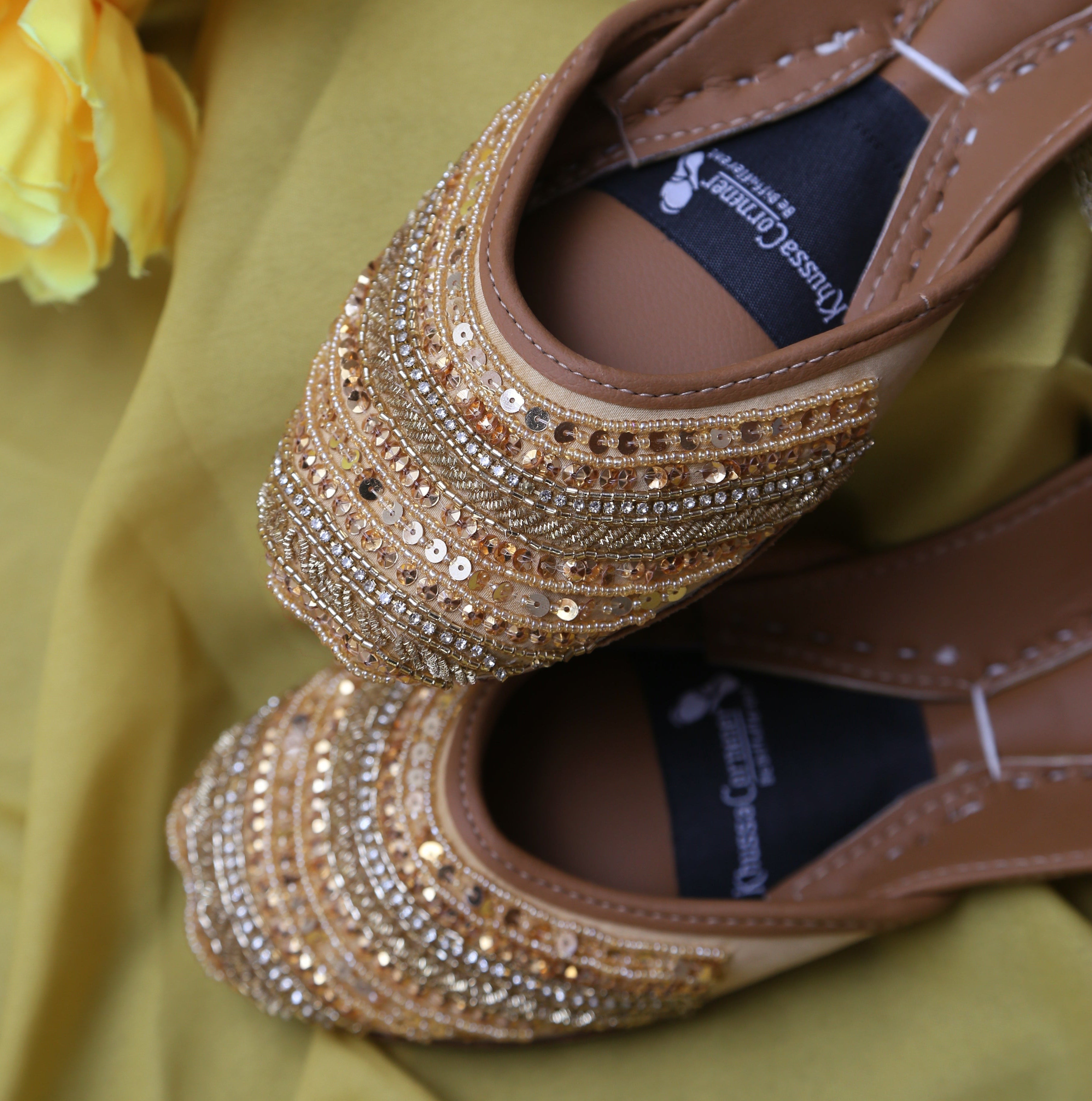 - Rich golden hand-embellished upper