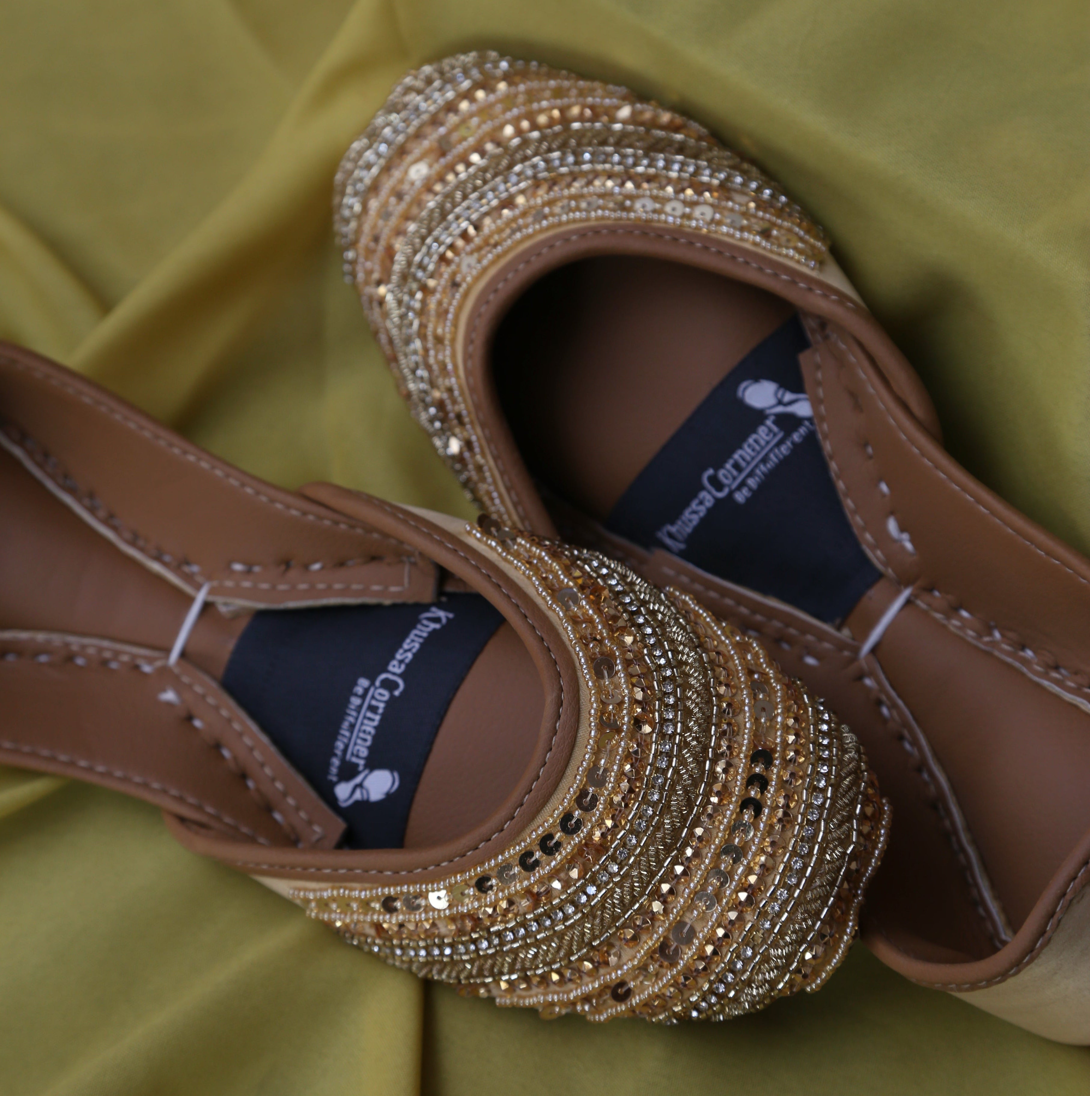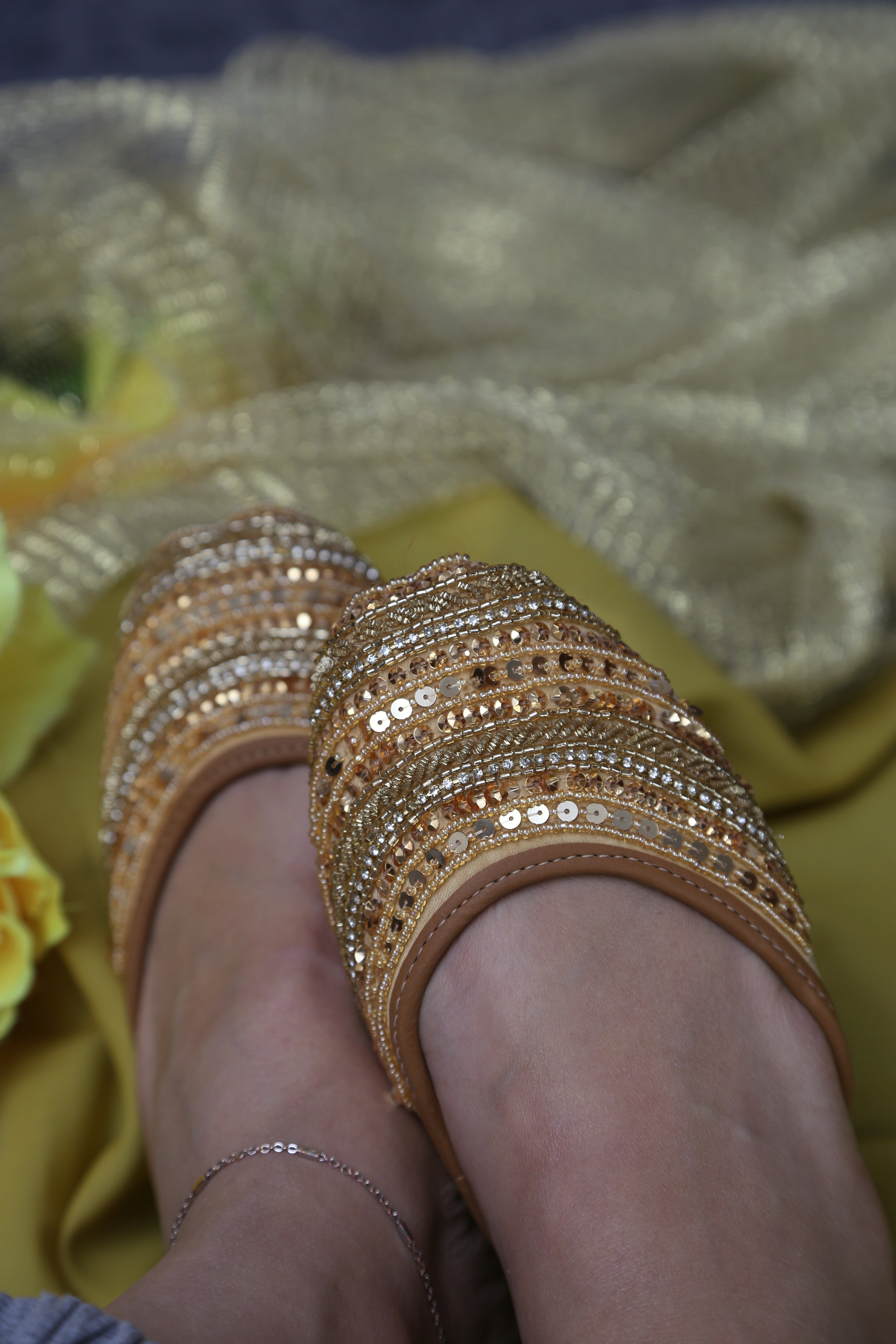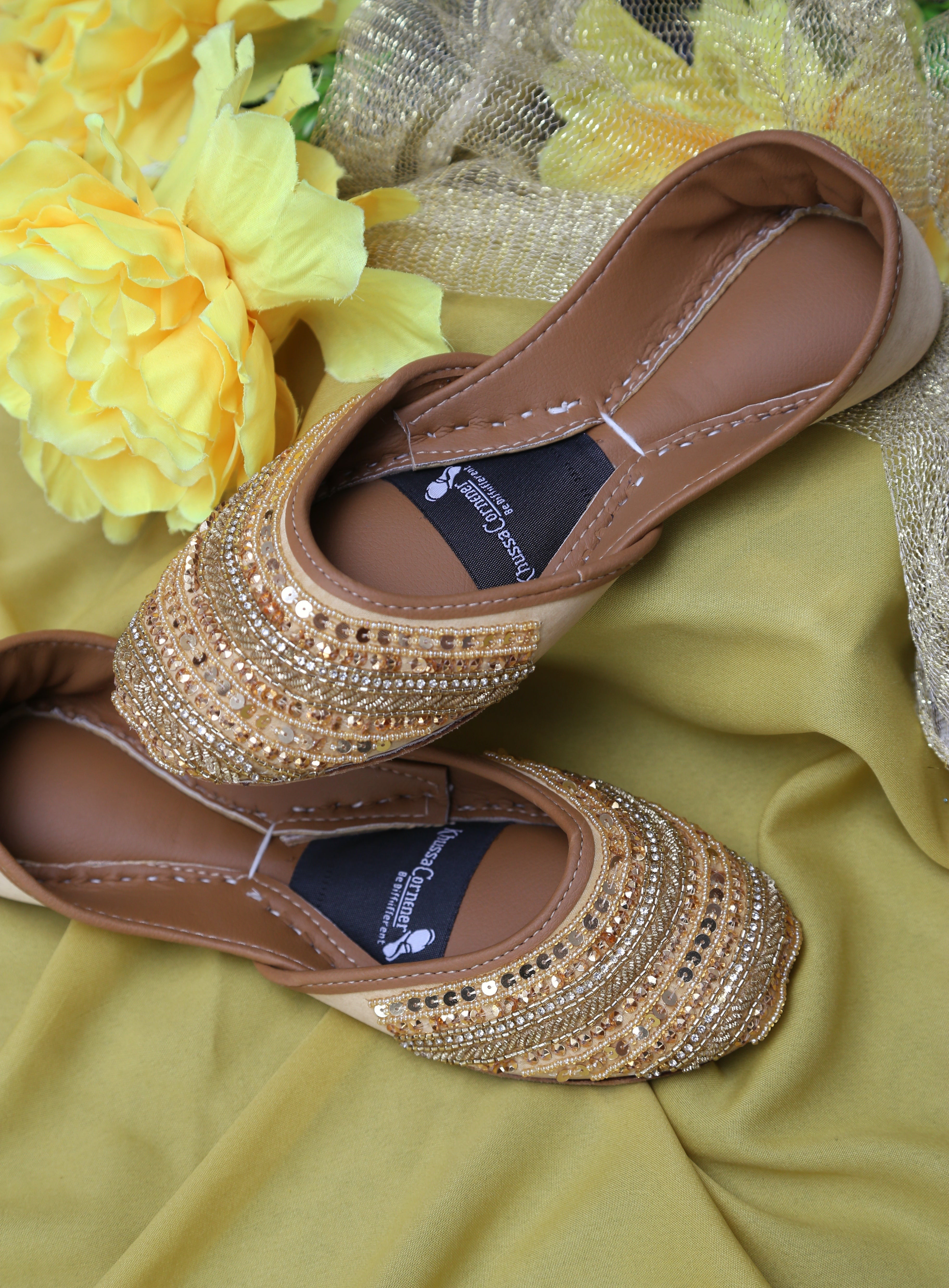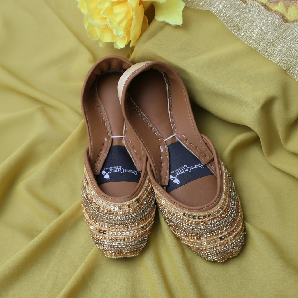 A radiant khussa designed to glow with every step. Featuring dense golden embellishment layered with fine sequins and beads, this pair captures festive elegance while staying comfortable for long wear.